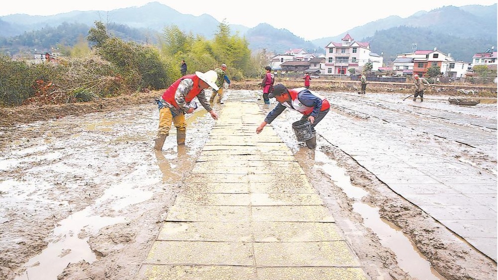 臺企南平市臺香生態農業發展有限公司位于邵武市水北鎮龍斗村的水田里,村民在科技特派員的指導下,修整秧苗床,播撒優質超級稻種子。