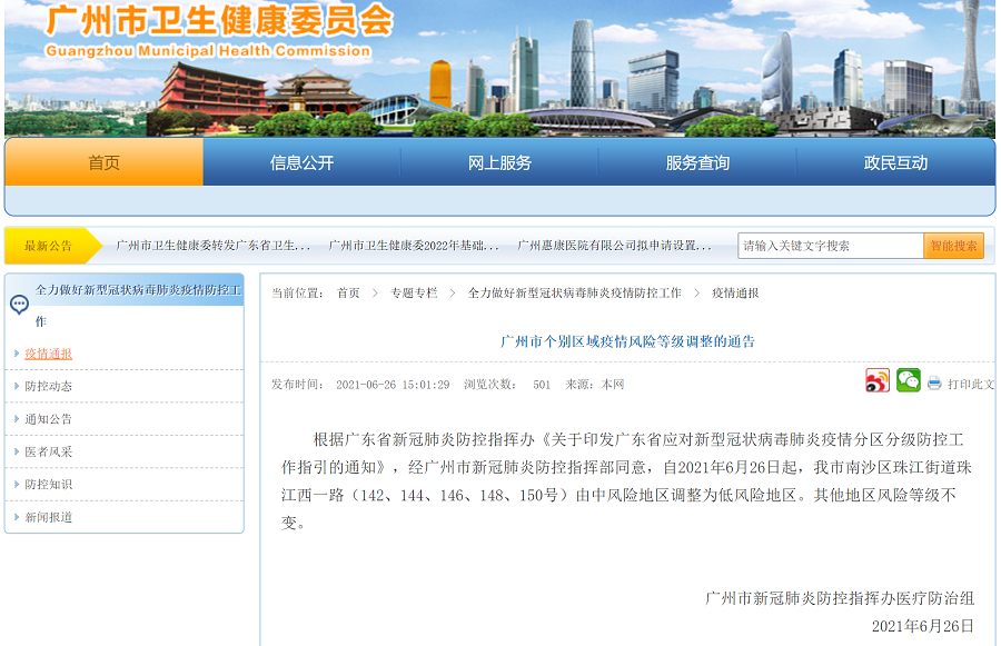 央廣網廣州6月26日消息(記者 張勝強)6月26日下午,廣州市衛健委先后發布《廣州市個別區域疫情風險等級調整的通告》和《廣州市部分區域疫情風險等級調整的通告》。據通報,南沙區、荔灣區、白云區的四個區域調整為低風險地區。目前廣州全市中風險地區清零。