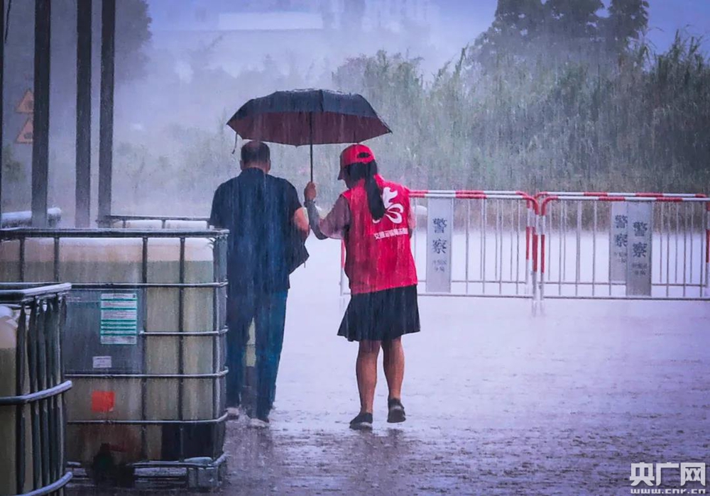央廣網中山9月5日消息(記者張勝強 通訊員曾毅峰)暴雨中,一位梳著馬尾辮的志愿者姑娘撐傘扶送一位老人。雨傘微微向老人身上傾斜,姑娘的衣服、鞋子、帽子早已被雨水打濕。