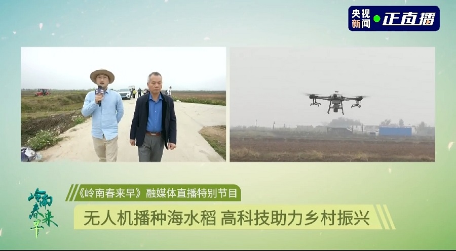 直播中,記者走進江門市臺山市海宴鎮,這里有著一片海水稻試驗田,農用無人機正在播撒海水稻種子,呈現出一派春耕景象。