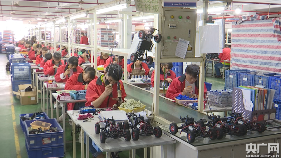 在廣東汕頭一家玩具工廠的生產線上,工人正熱火朝天地趕制一批玩具訂單。