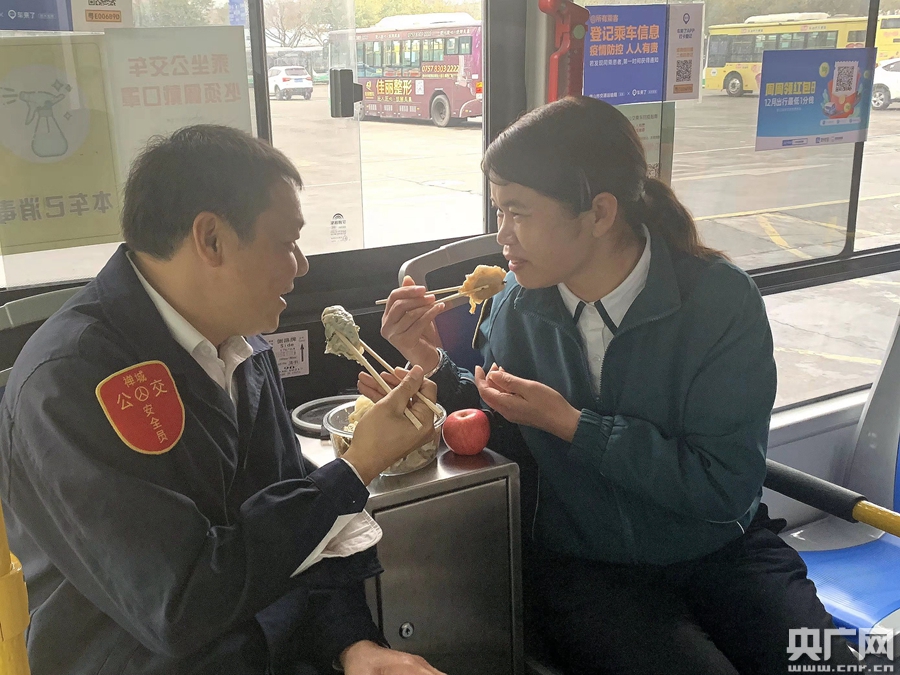 下午17:30分,胡幼瓊準時來到郊邊總站等著丈夫,這是晚班的吃飯時間。沒多久,覃重章就駕駛著118路公交車進站,路上車少,他比預定時間提早了回來,但胡幼瓊還是抓緊時間拿著餃子上車。今年的年夜飯,她特意包了“三鮮”“韭菜豬肉”兩種餃子餡,“因為他愛吃三鮮,所以我特別多做了幾只”,胡幼瓊還帶了大紅蘋果給丈夫,寓意“平平安安”。兩人在車廂中一邊吃著年夜飯,一邊通過手機和在老家的小兒子視頻聊天嘮家常。