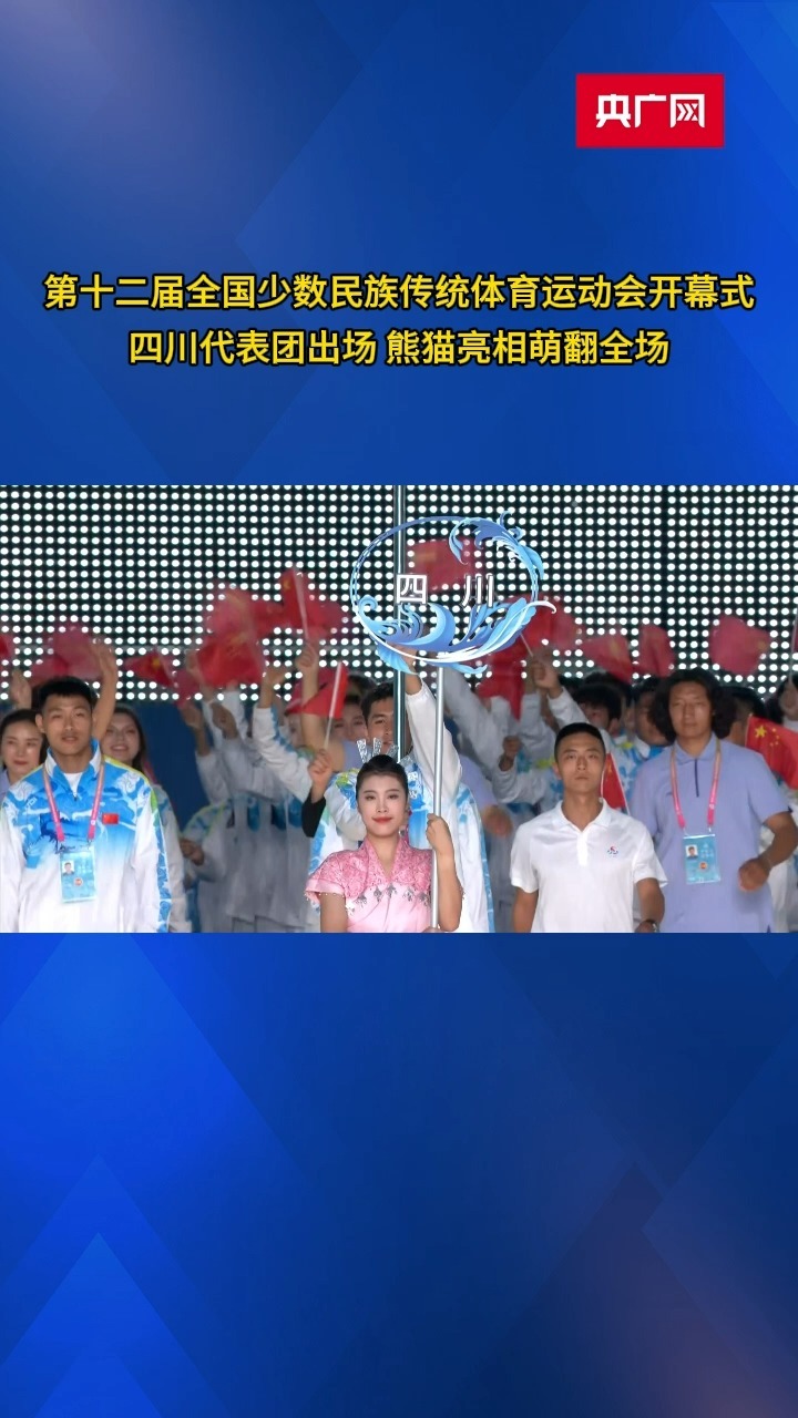 四川代表團入場時,兩只熊貓也蹦蹦跳跳地亮相現場,與觀眾揮手互動。