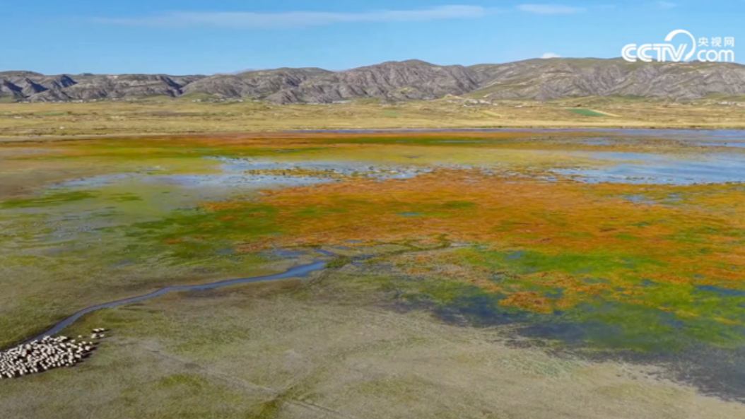在青海省海南藏族自治州共和縣,秋日的尕海灘草原鋪著金毯,羊群如散落的云朵。牧羊女揮鞭隨行,澄澈水面上,斑頭雁振翅掠過,牧歌與雁鳴交織,繪就一幅靈動的高原秋牧圖。