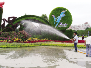 迎接全運盛會的到來,本市布置的立體園林景觀,前期的設計、栽植等工作,園林工人們付出了辛苦的努力。在它們華麗亮相之后,繁重的養護工作就開始了。據譚國棟主任介紹:從平時的養護細節上,安排了專業水車,每天進行澆水和專業“養顏”,這里面包括兩大部分,一部分是立體草雕,它們的高度從3米到8米不等,對于這些身材高大的“巨人”,在布置時,就已經在它們體內設置了“淋浴”系統,通過水車把水輸送到草雕上部就可以實現噴灌、滴灌、滲灌。所以,人們看到的草雕“津娃”,各種運動項目造型等等,都那么干凈、茂盛,這都是科學“洗澡”的功效。另一部分是平面的花卉澆水,主要通過水車,用噴淋,噴灑的形式進行水分供給,養護的時候還要看天氣的情況和花卉本身的干濕度進行水分養護,確保花卉正常生長。