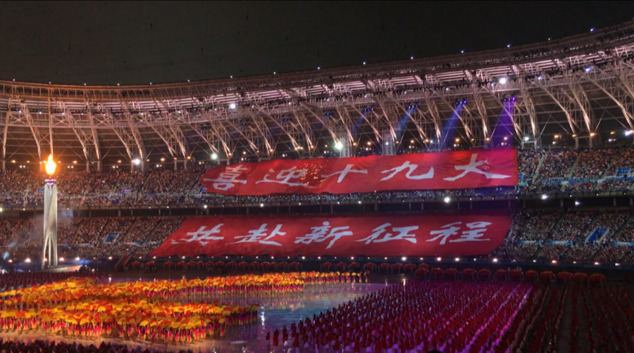 觀眾席上出現“喜迎十九大,共赴新征程”的標語
