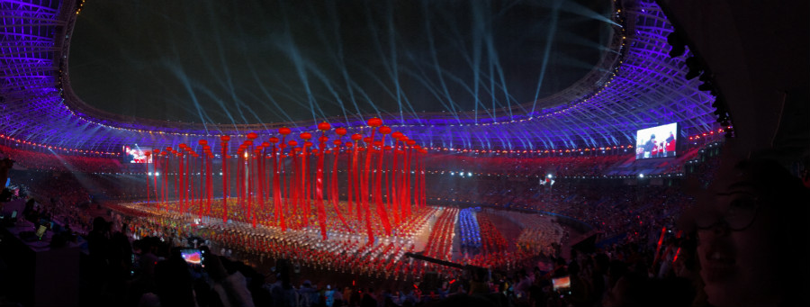 據了解,開幕式儀式及文體展演演員共6555名。除了少數專業文藝工作者和體育工作者,絕大部分是平時活躍在健身廣場的市民和普通的大中小學生,年齡最大的76歲,年齡最小的6歲。展演排練時間僅有兩個月,創國內大型體育活動開幕式排練時間最短記錄。