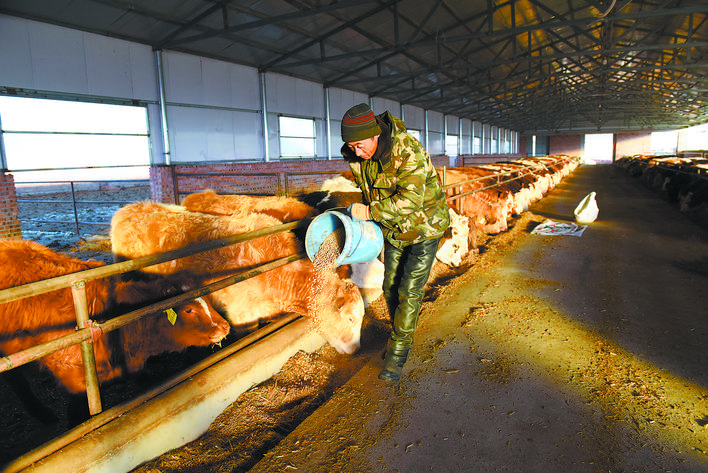 12月12日,內蒙古林西縣新林鎮七一村肉牛養殖園區,養殖戶在喂牛。